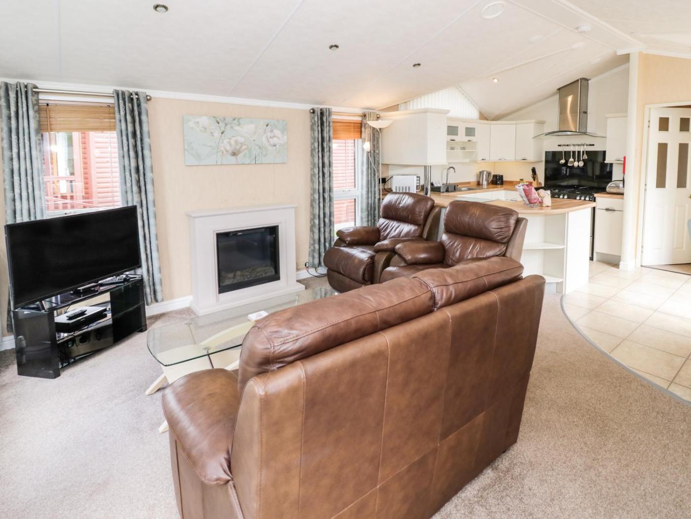 Holiday Home. This holiday homes special feature is the fireplace. This holiday home includes 2 bedrooms, a seating area with a sofa and 2 bathrooms with a walk-in shower. Guests can make meals in the kitchen that has a stovetop, a refrigerator, a dishwasher and an oven. The holiday home offers a washing machine, a dining area, a wardrobe, an electric kettle, as well as a TV. The unit has 3 beds.