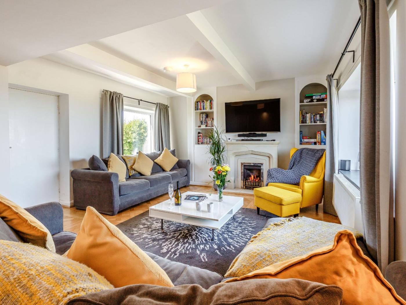 The spacious holiday home has 3 bedrooms, a TV, a fully equipped kitchen with a dishwasher and an oven, a washing machine, and 2 bathrooms with a hot tub. There is also a seating area and a fireplace.
