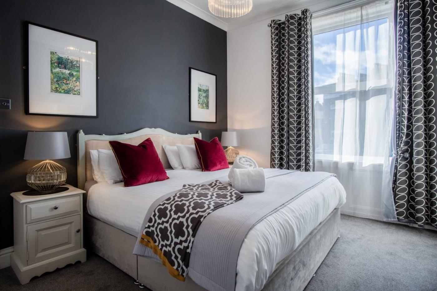 Two-Bedroom Apartment. Luxury 2-Bedroom Apartment (Sleeps 2-4). Lower ground floor, light apartment with big windows but no view. Modern and stylish. Large open-plan kitchen, dining area and lounge with 50 inch Smart TV and gas fire place (and central heating). Master bedroom king-size pocket sprung bed and 26" Digital TV. Small 2nd bedroom with a bunk bed (2nd bedroom ideal for 2 children or suitable for 1 Adult). Bedrooms overlook private rear courtyard. Fresh linen and soft towels are provided.rooms have blackout curtains. Bathroom with combined bath and shower. Free Wi-Fi. Families and couples welcome. We dont accept groups.